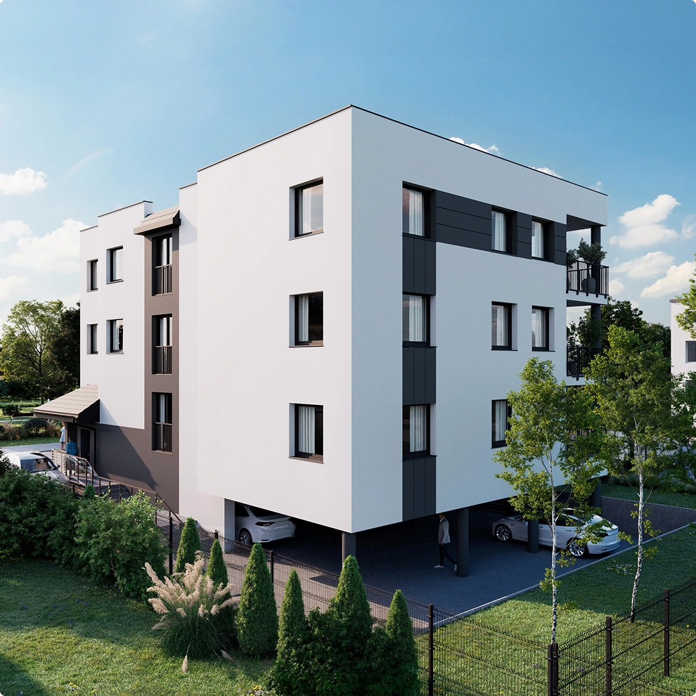 Budynek charakteryzuje się wysoką efektywnością energetyczną, co przekłada się na niższe koszty utrzymania. Wykorzystujemy wyłącznie materiały najwyższej jakości, dbając o każdy szczegół. Inwestycja wyróżnia się nowoczesną architekturą, która idealnie wpisuje się w otoczenie.