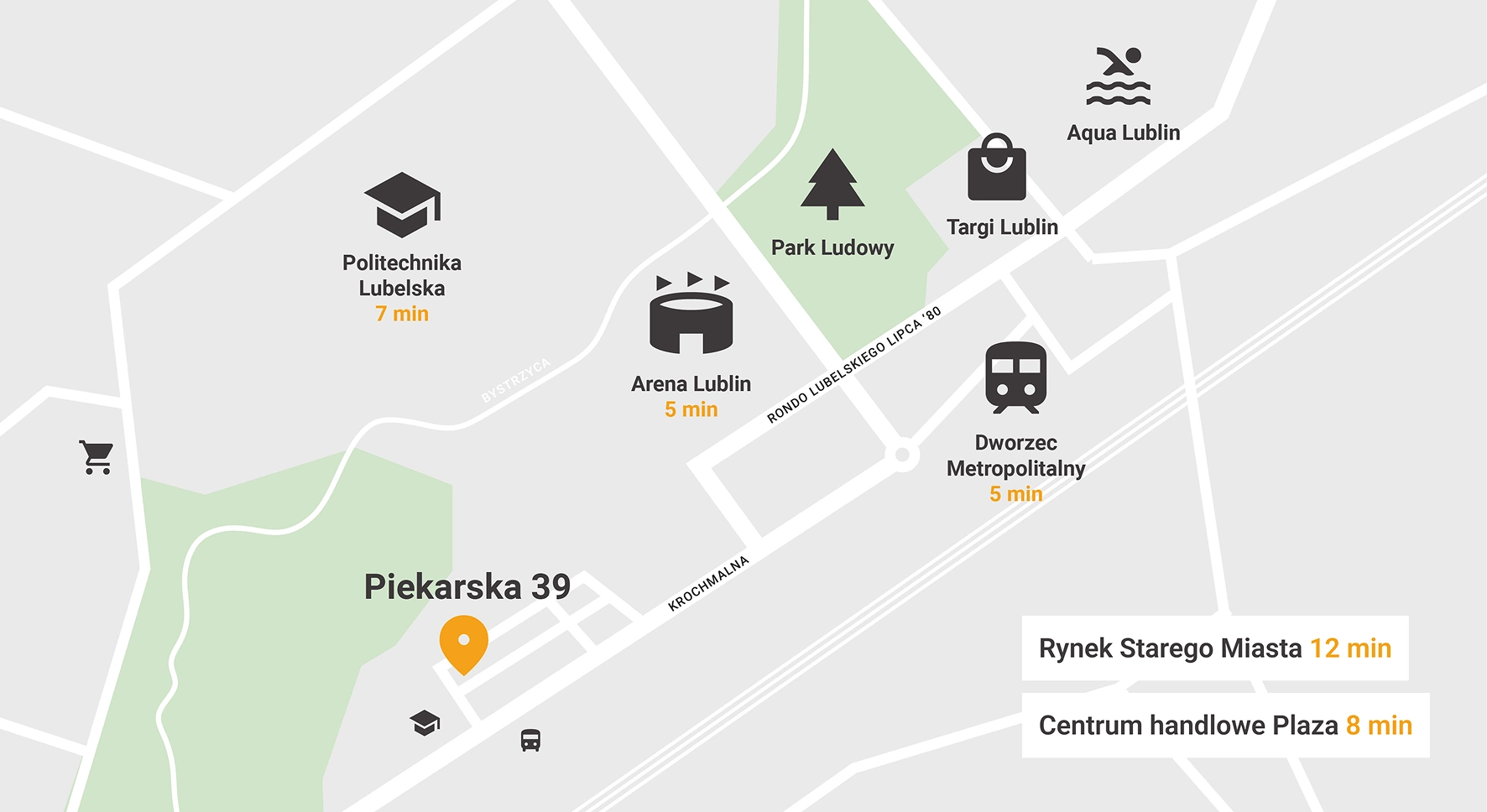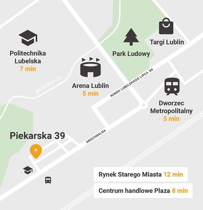 Połączenie miejskiej wygody i bliskości natury. Inwestycja jest położona zaledwie 1,5 km od Politechniki Lubelskiej i 1,9 km od Dworca Lublin, zapewniając skomunikowanie z całym miastem. W okolicy znajdują się również liczne sklepy, restauracje i punkty usługowe. Tuż obok rozpościerają się tereny zielone, takie jak Dolina Bystrzycy.